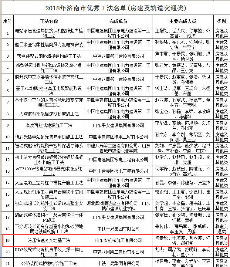 《2018年濟(jì)南市優(yōu)秀工法》名單出爐,山東機(jī)施與多家“中”字頭國(guó)企并駕齊驅(qū),更是基礎(chǔ)建設(shè)行業(yè)中唯一上榜企業(yè)。
