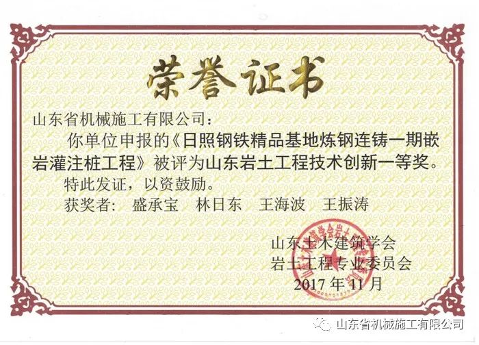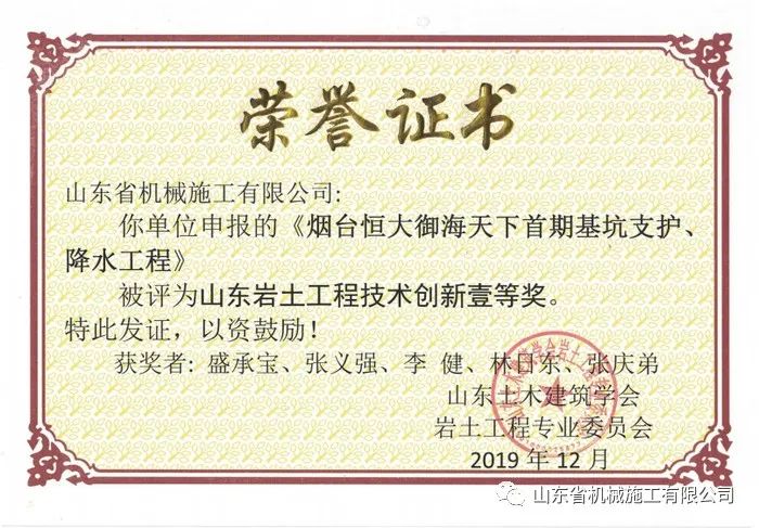 多年的堅持和努力,盛承寶也收獲累累,其任項目經(jīng)理期間所承建的工程多次榮獲《山東巖土工程技術(shù)創(chuàng)新壹等獎》,個人屢次被評為山東機施優(yōu)秀項目經(jīng)理。還通過了高級工程師評審及建造師考試,更令他感到光榮的是2021年被推薦成為中國共產(chǎn)黨入黨積極分子。