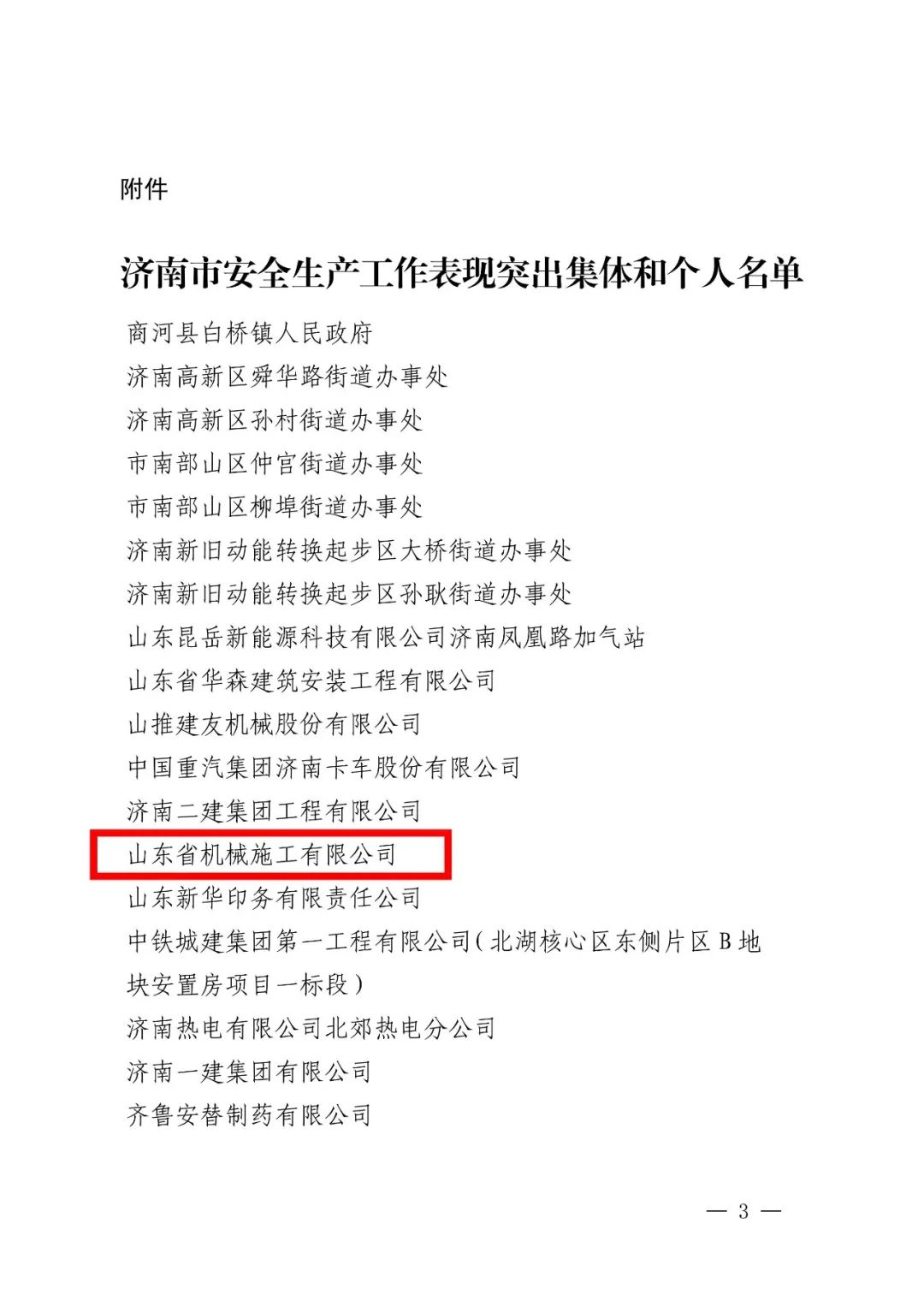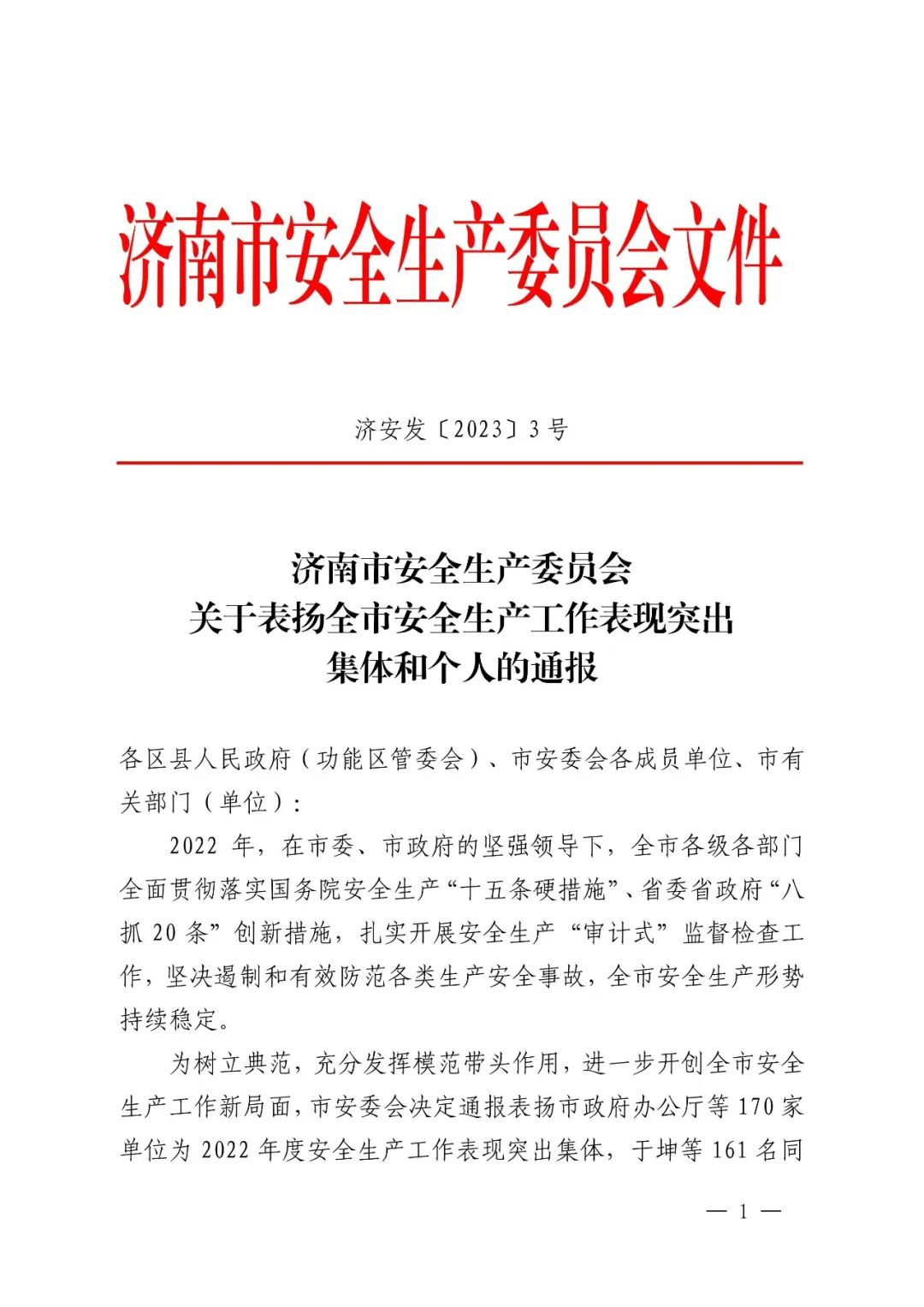 近日,山東省機械施工有限公司被濟南市安全生產委員會評選為2022年度安全生產工作表現(xiàn)突出集體。這是公司繼榮獲濟南市防汛管理先進單位后,再次獲得市安委會肯定,本次獲獎槐蔭區(qū)僅兩家單位,公司位列其一。