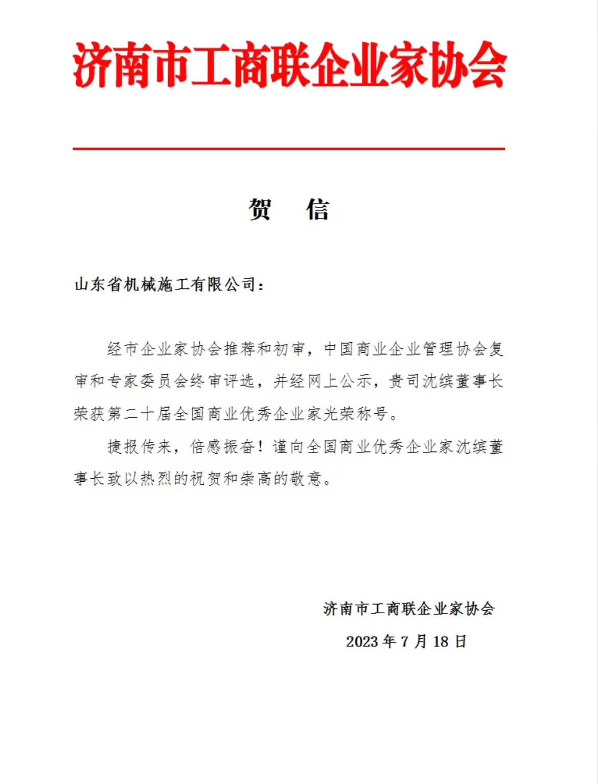 7月18日,山東省機(jī)械施工有限公司沈繽董事長憑借在業(yè)內(nèi)取得的突出成績和做出的杰出貢獻(xiàn),經(jīng)濟(jì)南市工商聯(lián)企業(yè)家協(xié)會推薦和初審,中國商業(yè)企業(yè)管理協(xié)會復(fù)審和專家委員會終審評選,并經(jīng)網(wǎng)上公示,繼2020年榮獲“全國商業(yè)優(yōu)秀企業(yè)家獎(jiǎng)”后,再次榮獲“全國商業(yè)優(yōu)秀企業(yè)家”光榮稱號。