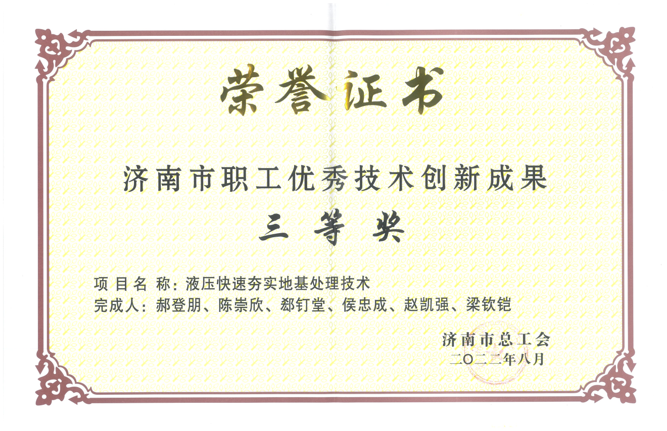 該技術(shù)先后被評為“山東省省級工程建設(shè)工法”、“山東土木建筑學(xué)會團(tuán)體標(biāo)準(zhǔn)”,2022年8月被濟(jì)南市總工會評為“濟(jì)南市職工優(yōu)秀技術(shù)創(chuàng)新成果三等獎”,同年12月參加山東省職工創(chuàng)新創(chuàng)效競賽省級決賽榮獲二等獎,獲山東省總工會獎勵10萬元。
