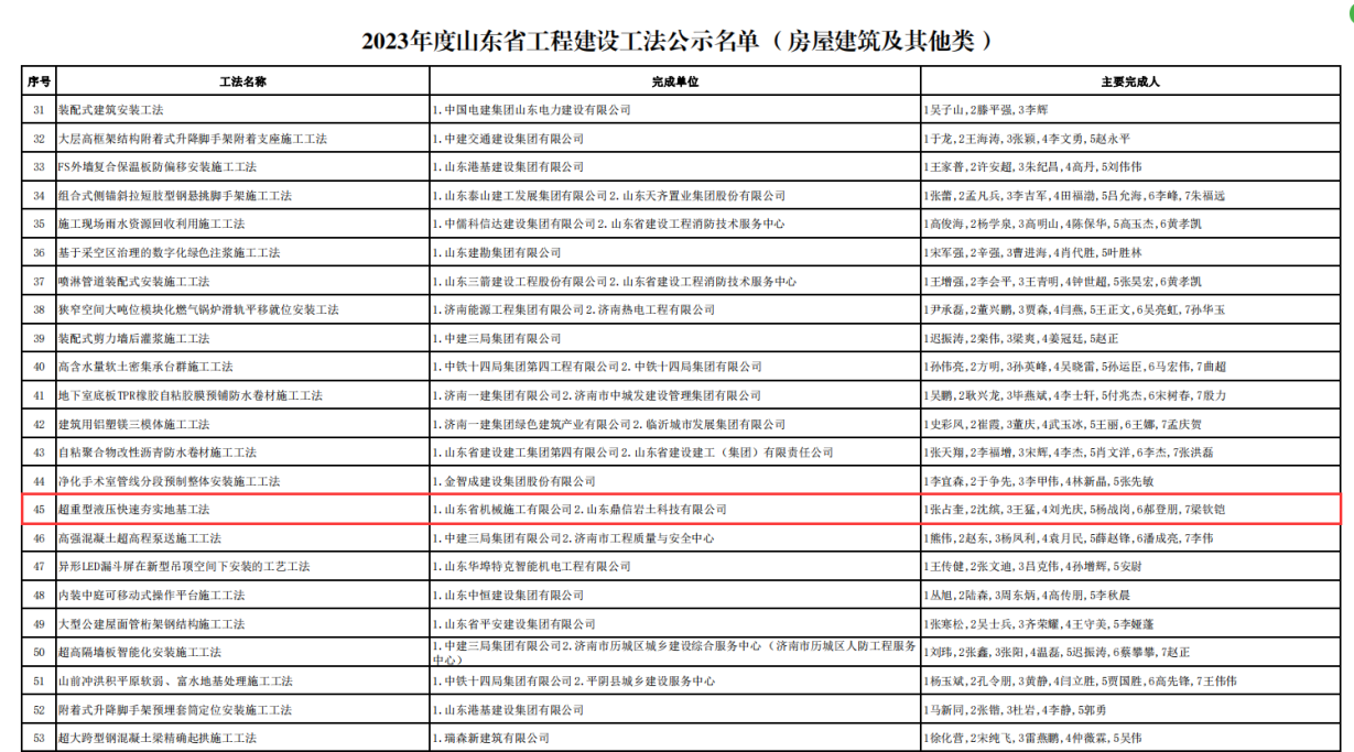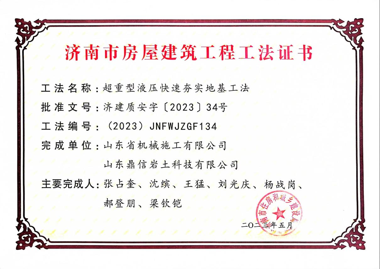山東省工程建設(shè)工法是經(jīng)所在市住房城鄉(xiāng)建設(shè)主管部門從當(dāng)年評(píng)選的市級(jí)工法中擇優(yōu)推薦的優(yōu)秀工法。2023年,“超重型液壓快速夯實(shí)地基工法”獲評(píng)“濟(jì)南市工程建設(shè)工法”,如今經(jīng)過(guò)企業(yè)申報(bào)、各市推薦、專家評(píng)價(jià)、集中評(píng)審,被確定為2023年度“山東省工程建設(shè)工法”。